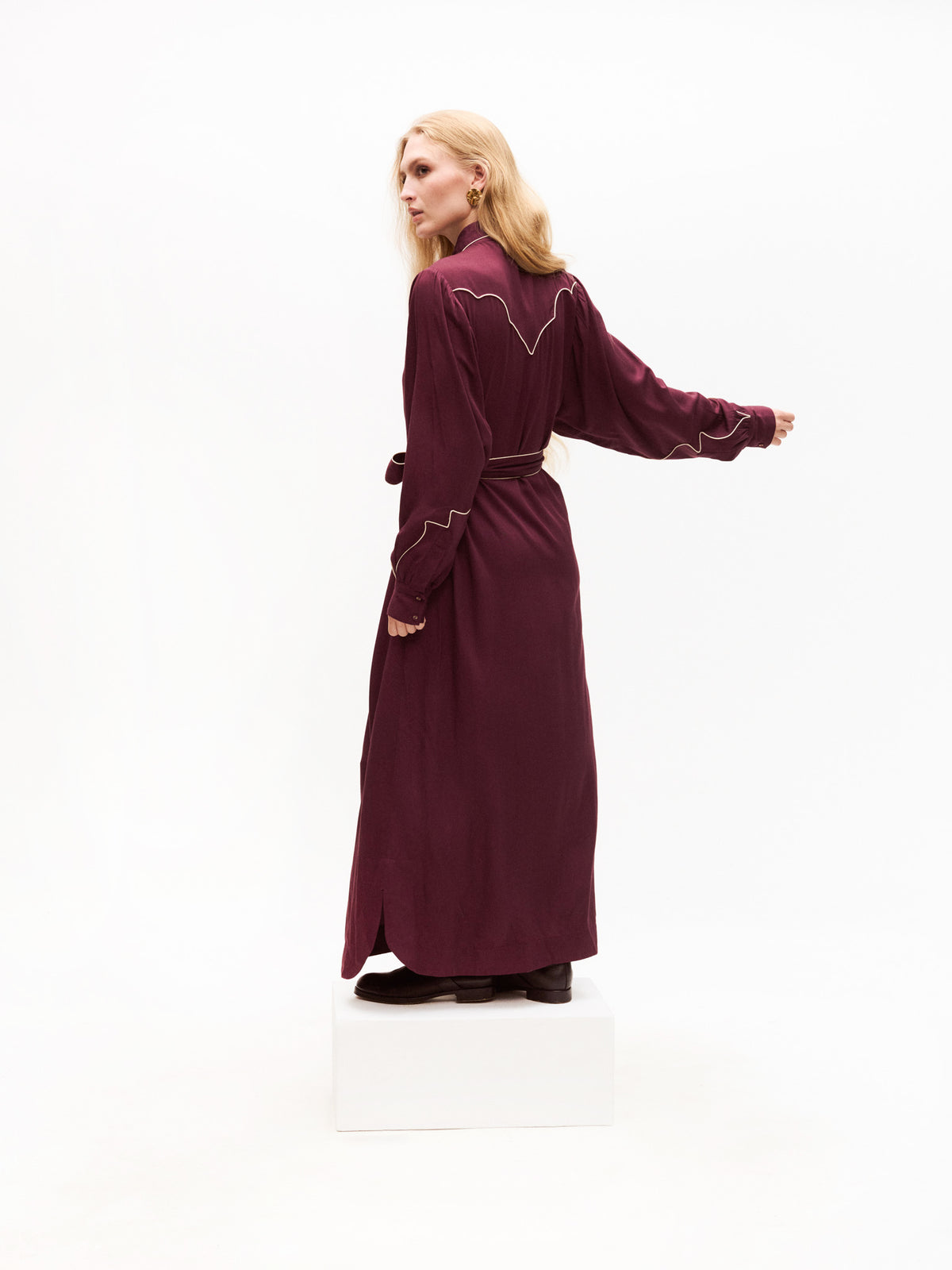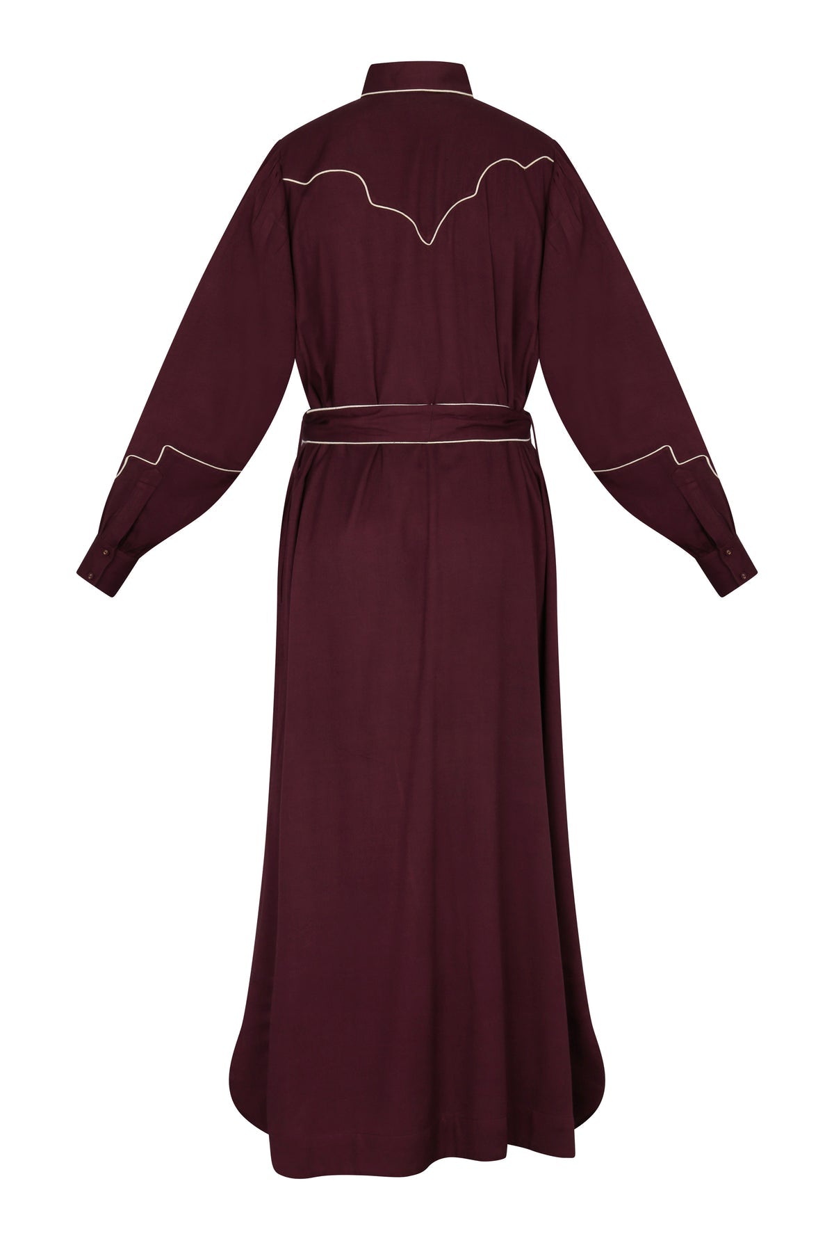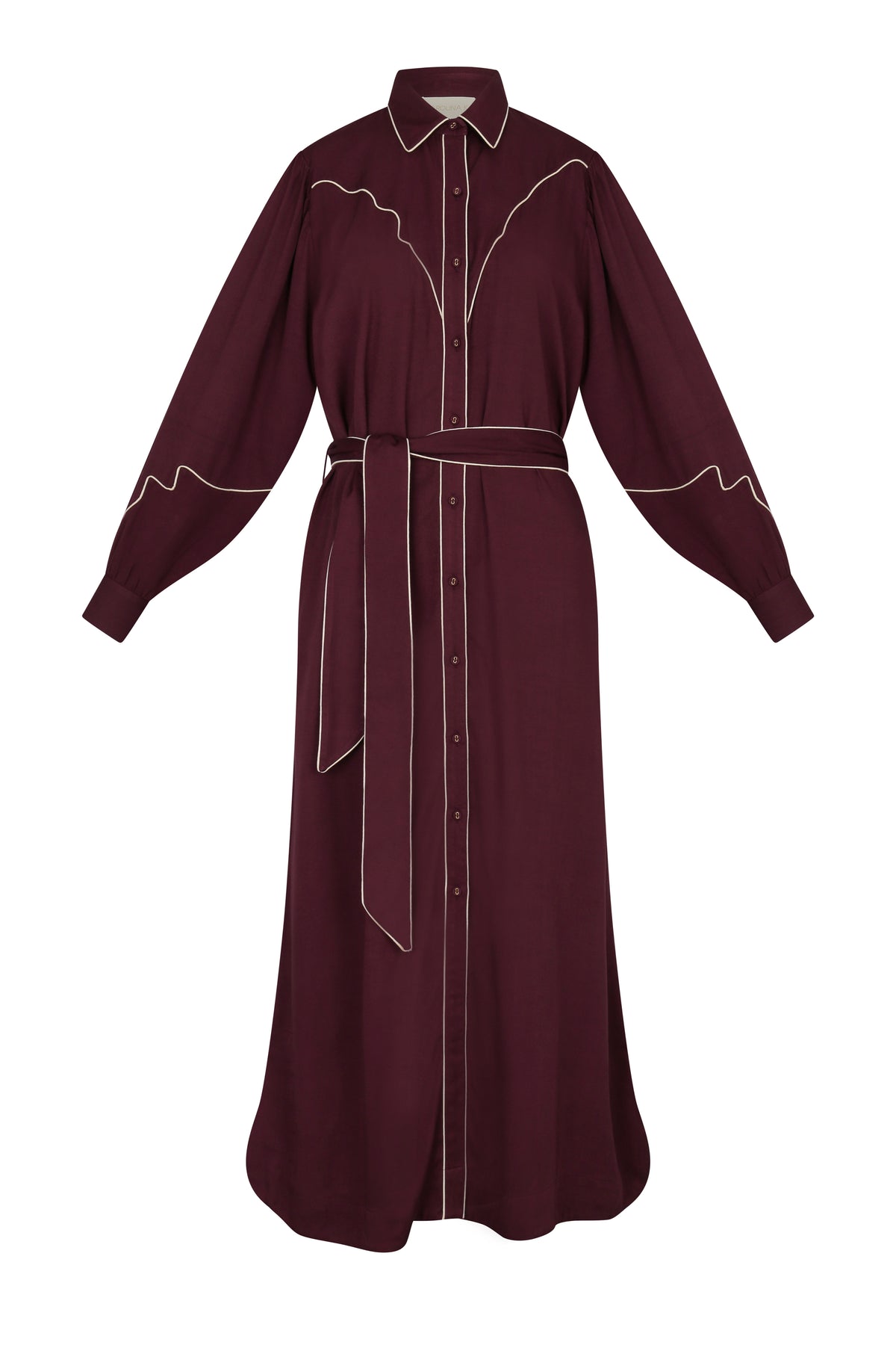 - Burgundy long-sleeve shirtdress with a button-down front and white contrast piping outlining the shoulders, front placket, and sleeves