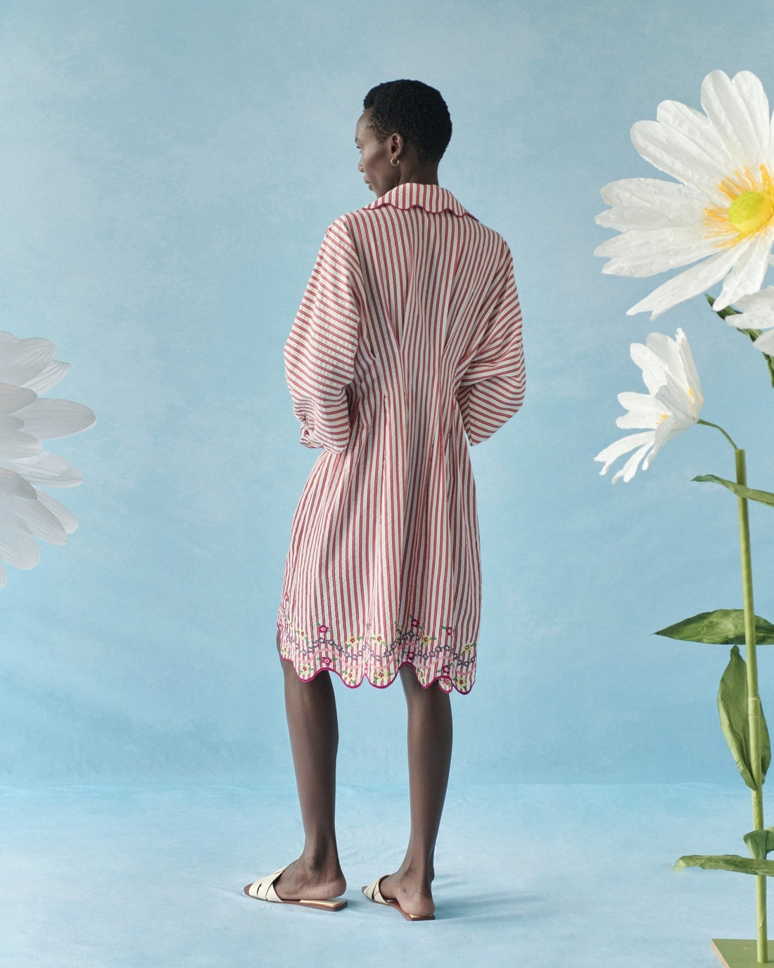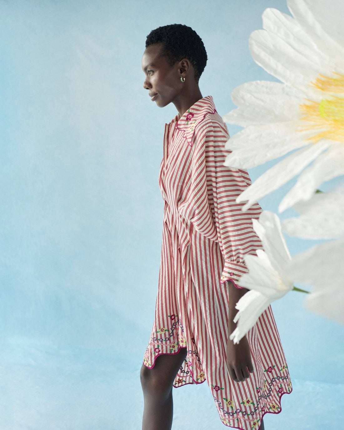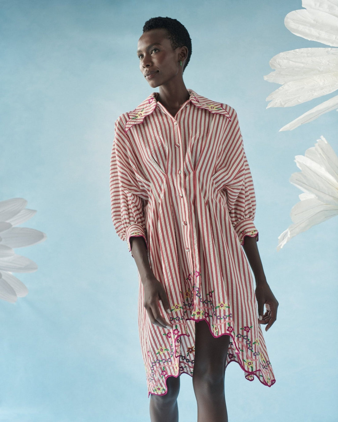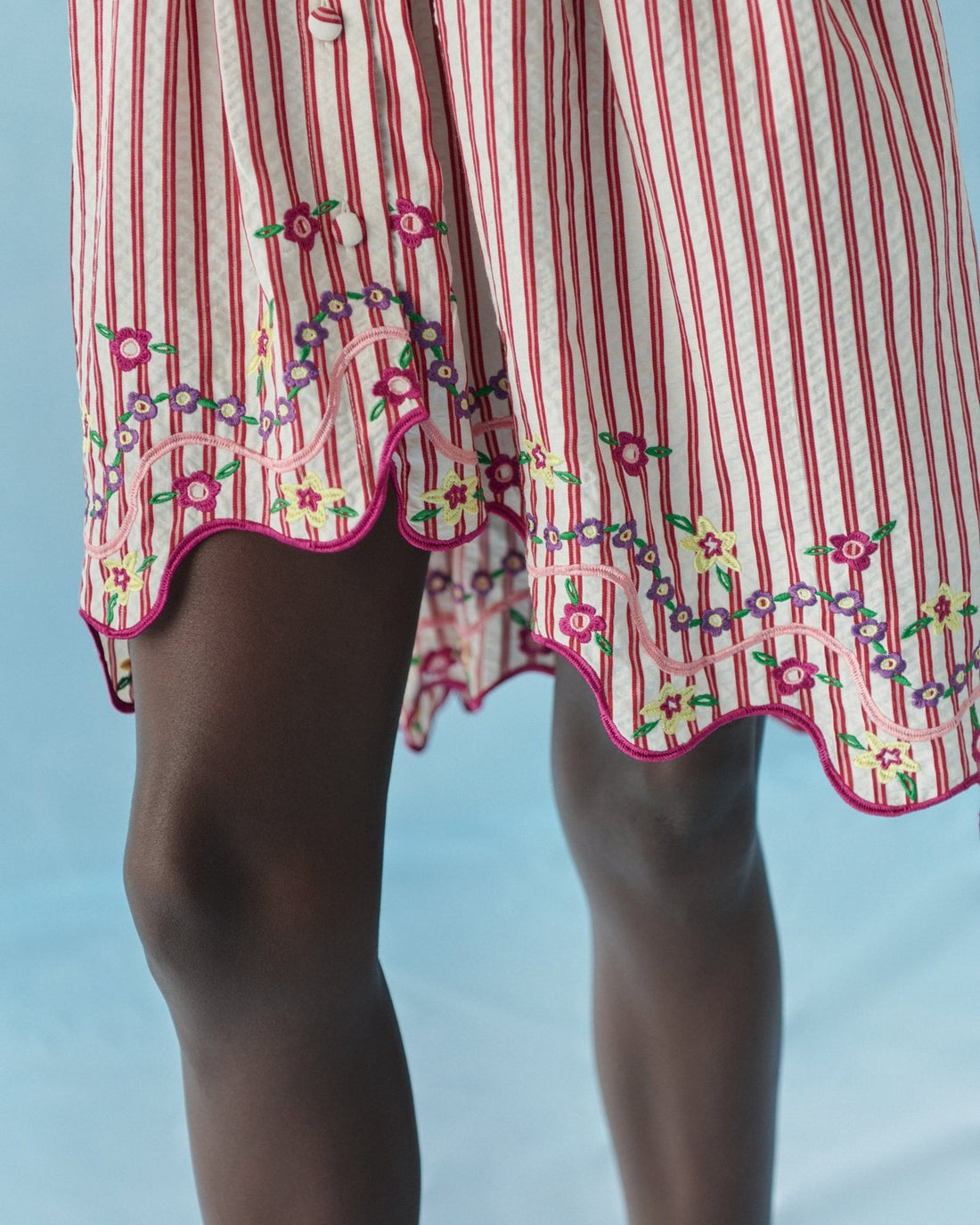 - Red and White Stripes with Floral Embroidery On Hem and Cuffs