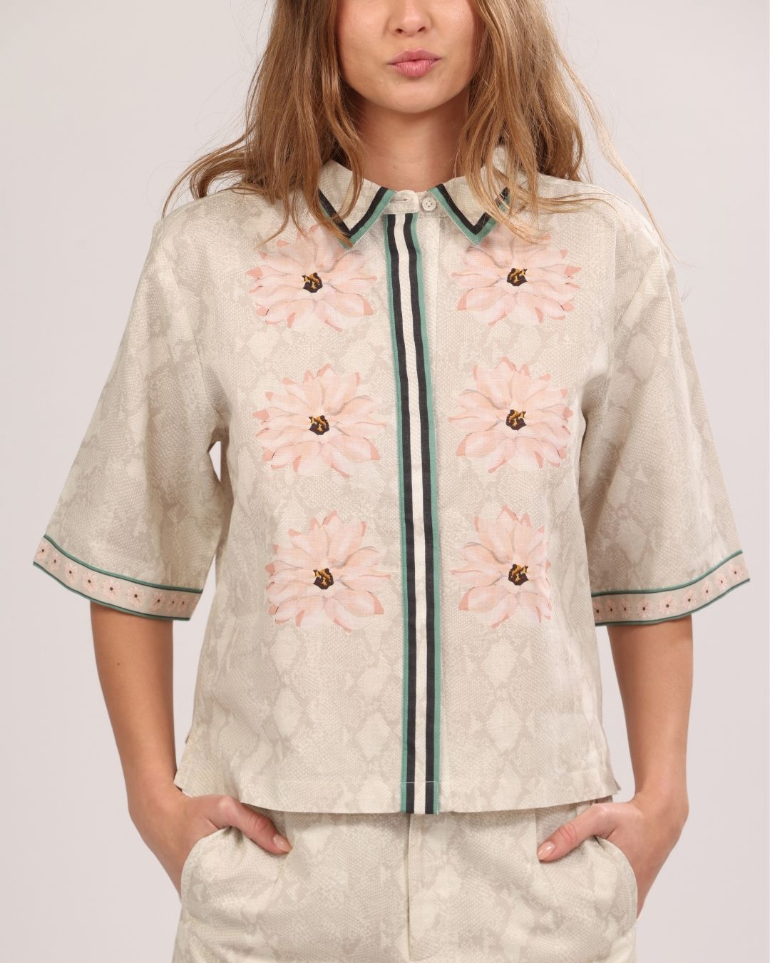 - Beige with Gray Snake Print with Floral Details and Contrast Web Stripe