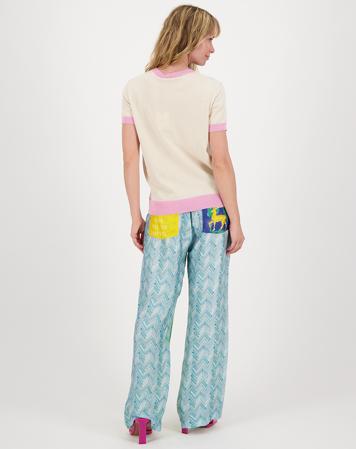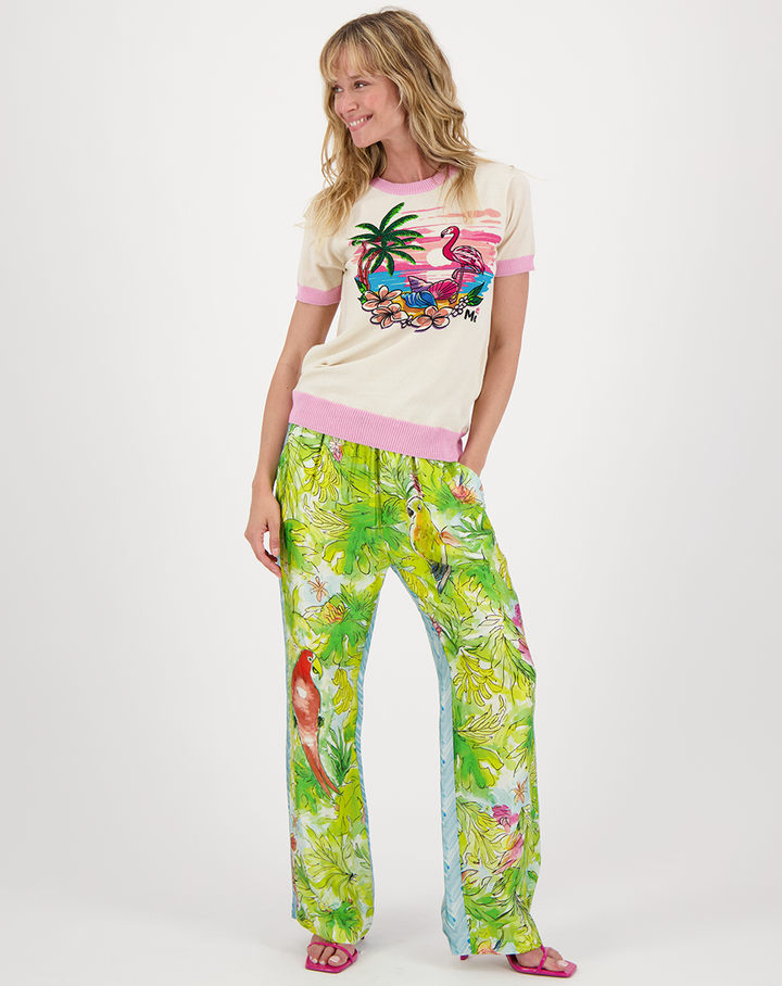 - Cream with Pink Ribbed Knit Trim and Multicolored Print