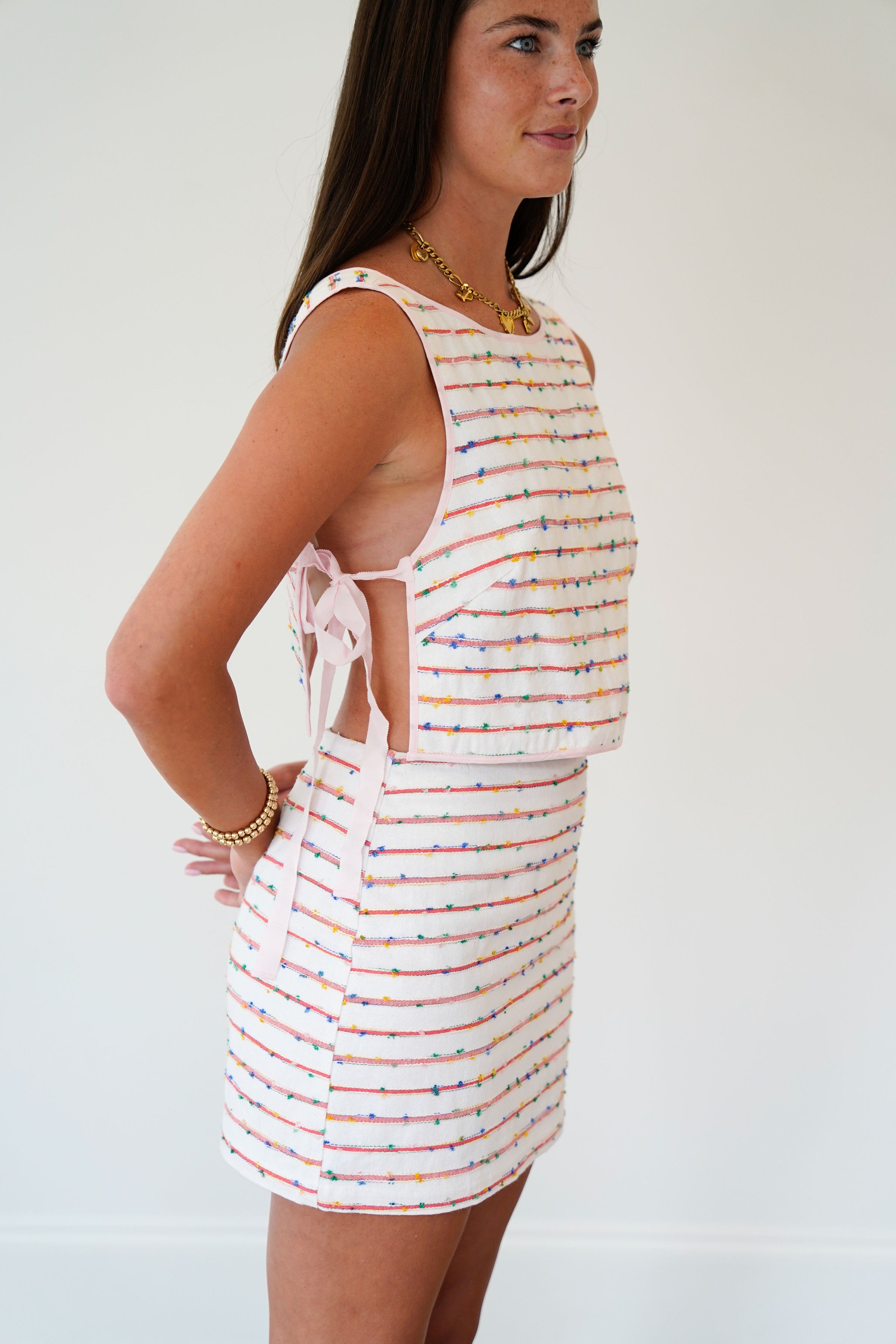 - White with Pink Stripes and Multicolored Pom Pom Embellishment