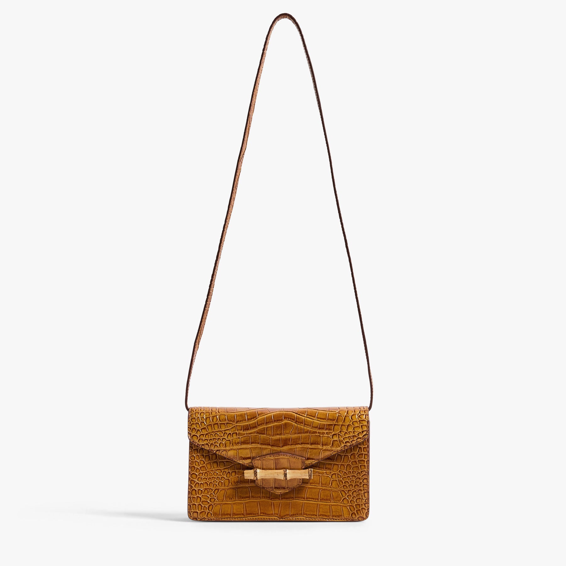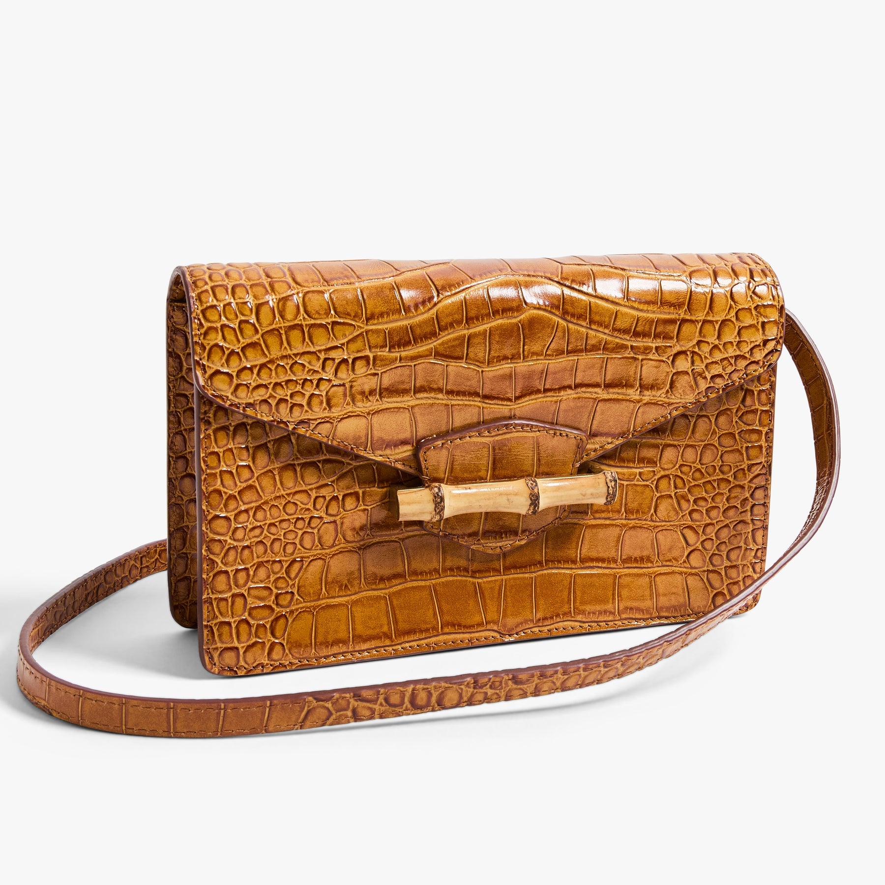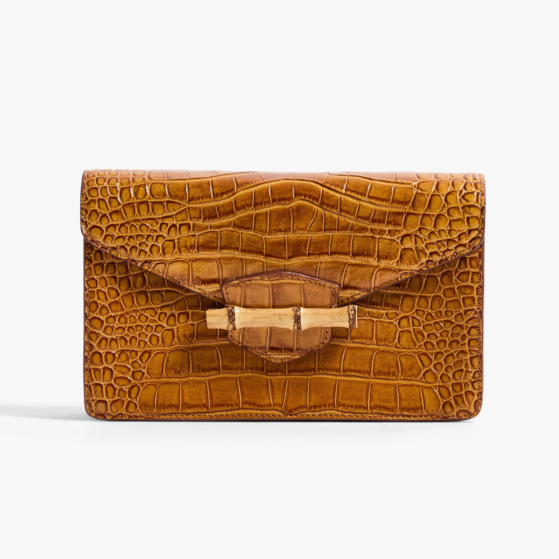 - Croc-embossed structural clutch with bamboo closure
